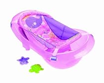 Fisher-Price Ocean Wonders Pink Sparkles TubMake bath time more comfortable for you and baby with the Pink Sparkles Tub that grows with baby girl from newborn to toddler! The unique sling supports and cradles your newborn comfortably and safely. As she grows the sling can be adjusted to hang from the narrow end of the tub to provide reclining support. When she needs more room she can sit at the wider end of the tub. Lots of bathtime accessories and an infant head support included.