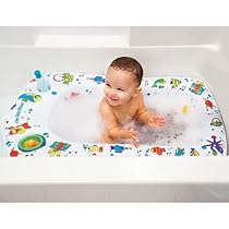 The Fisher-Price Rainforest Bath Center brings a comfortable bath time experience to both baby and mom in three stages of use (Newborn Infant and Older Infant/Toddler) in a very fresh translucent tub. A wonderful bolstered soft sling with separate head support cradles newborns for mom then detaches from one end to lie over the small end of the tub as a pad for more active babies. When baby can sit up alone the large end of the tub provides just the right sized tub for lots of fun play.